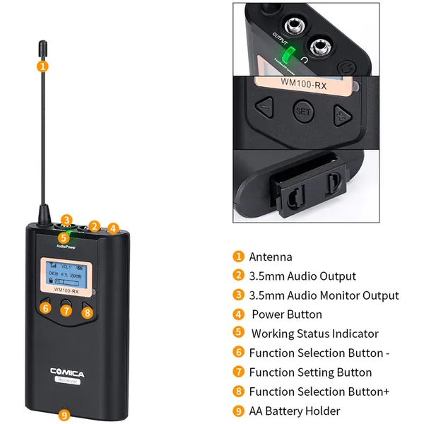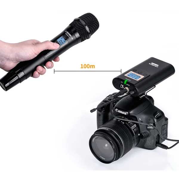 Designed for mobile journalists, news gatherers, and videographers, the Comica Audio CVM-WM100H camera-mount wireless handheld microphone system is a complete solution for recording interviews and speech to your video rig. Record your handheld mic from up to 328' away and run audio to your camera, DSLR, or camcorder while monitoring through headphones in real time. Locking connections on the receiver eliminate unintended cable disconnects.