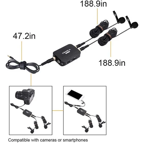 The Comica Audio DUAL.LAV D03 provides podcasters, mobile journalists, and documentary makers with a cost-effective solution that simplifies recording two-person interviews. It comes with two lavalier microphones that let you record clear and accurate speech directly to the single input of your DSLR/mirrorless camera or audio recorder, while monitoring your sound. It can also be used with an iPhone/Android smartphone/tablet that's equipped with a headphone jack.