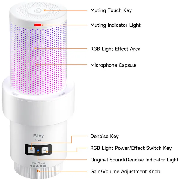 Intuitive controls include a convenient volume knob and a touch-sensitive One-Key Muting button. Real-time audio monitoring is supported via a built-in headphone jack. The EJoy Uni's USB-C plug-and-play design with an integrated sound card guarantees broad compatibility across smartphones and computers—without the hassle of driver installations.