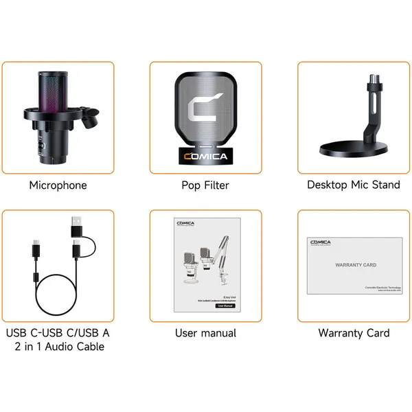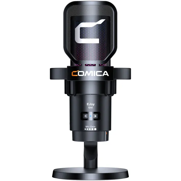 Comica EJoy Uni D is a versatile USB-C microphone intended for streaming, podcasting, gaming, meetings, and content creation. It comes equipped with a desktop stand, shockmount, and pop filter. Featuring One-Key Denoise technology to minimize background noise, a condenser capsule with a cardioid polar pattern for precise sound pickup, and 24-bit / 48 kHz conversion, the mic delivers high-quality, crystal-clear sound. Dynamic RGB lighting with three customizable effects allows you to set the mood and enhance your setup's visual appeal.