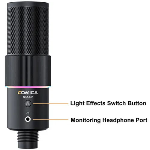 The STA-U2A sports a dynamic RGB ring light with six distinct effects, including audio dynamics, Comica orange, ocean waves, breathing lights, RGB slow waves, and rotating rainbows. Whether you are recording, live streaming, or podcasting, the immersive lighting effects will create an enticing atmosphere.