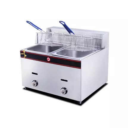Key Feature: Dual Tanks with Dual Baskets : Allows for simultaneous frying of different foods or larger batches of the same food, improving efficiency and throughput. High-Quality Construction : Built with durable materials, likely stainless steel, ensuring longevity and resistance to corrosion in a busy kitchen environment. Gas-Powered Operation : Efficient gas burners provide rapid heating and precise temperature control, enabling consistent frying temperatures even during peak hours. Large Oil Capacity : Each tank is likely sizable, accommodating a large volume of oil to handle high-demand frying, perfect for commercial settings. Specification: Material : Stainless Steel Dimension : 600 * 650 * 560 mm Temperature:60~200 ℃ Capacity : 12.5L + 12.5L