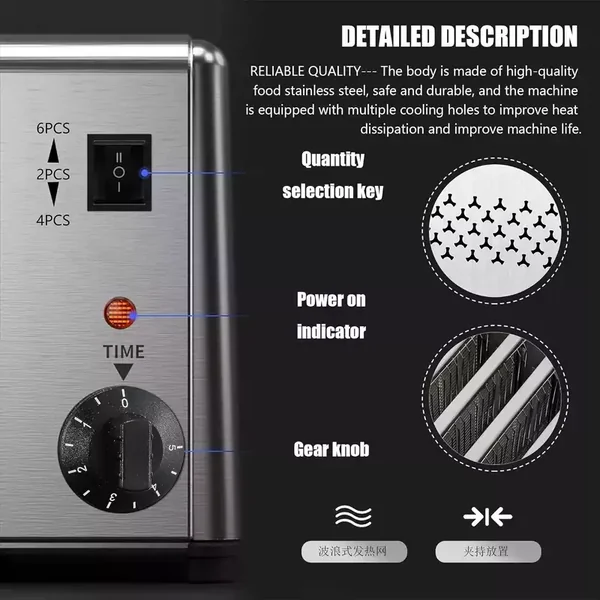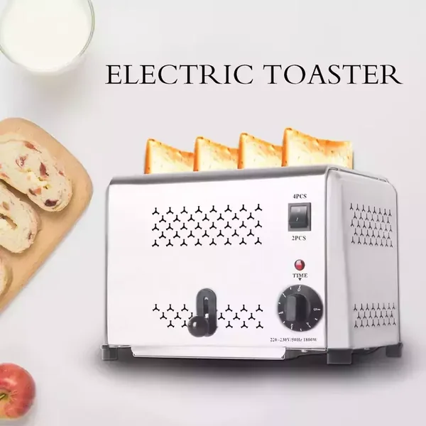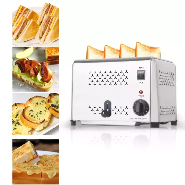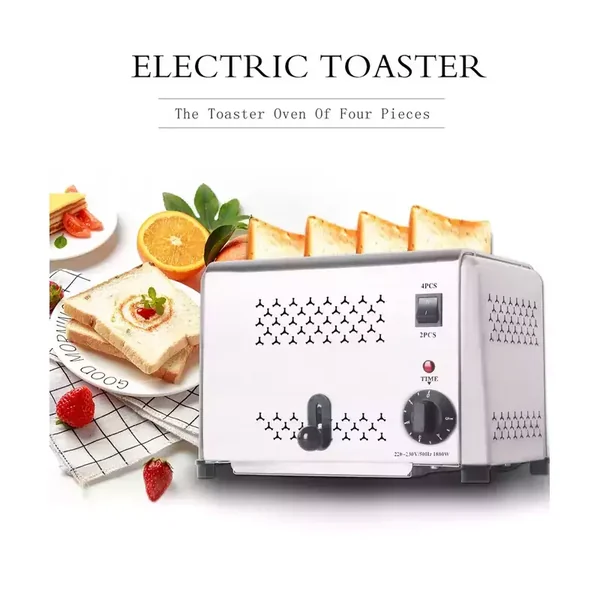 This 1800W commercial 4-slice toaster is designed for professional environments such as buffets and catering services, offering robust performance in a compact, space-saving design for easy integration into any kitchen workflow.