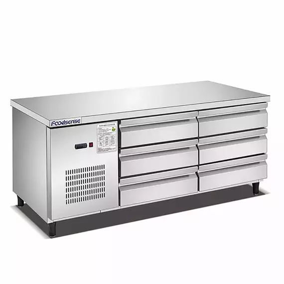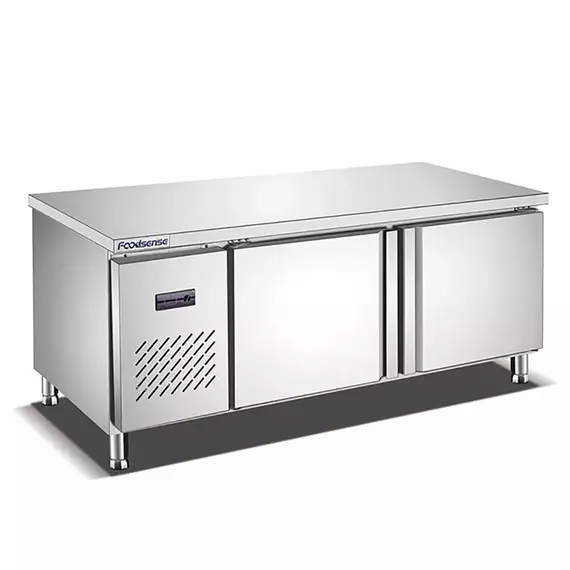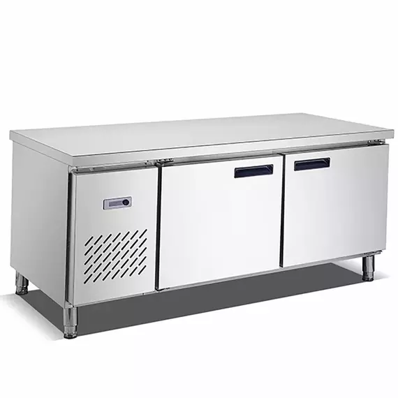 Key Feature: Integrated Refrigeration : The TC0.4L2T combines a refrigerated storage unit with a sturdy worktable, allowing for efficient food preparation and easy access to chilled ingredients. Large Capacity : The fridge work table offers ample refrigerated storage space for keeping ingredients, condiments, and other perishable items readily accessible during food preparation. Compact Design : The compact design of the TC0.4L2T makes it ideal for small to medium-sized commercial kitchens with limited space, maximizing efficiency and workflow. Stainless Steel Construction : Built with durable stainless steel materials, the fridge work table is sturdy, easy to clean, and resistant to corrosion, ensuring longevity in demanding kitchen environments. Refrigerated Storage Compartments : Features refrigerated storage compartments with doors, providing organized storage for different types of ingredients while keeping them at the optimal temperature. Adjustable Shelves : The shelves inside the refrigerated compartments are adjustable, allowing for flexible storage configurations to accommodate items of various sizes and shapes. Digital Temperature Control : Equipped with digital temperature control, allowing for precise adjustment of the internal temperature to suit the specific storage requirements of different types of food items. Efficient Cooling System : The TC0.4L2T is equipped with an efficient cooling system that ensures rapid and uniform cooling throughout the refrigerated compartments, maintaining consistent temperatures to preserve the freshness and quality of stored food items. Insulated Work Surface : The worktable features an insulated surface that helps maintain a consistent temperature, making it suitable for various food preparation tasks, such as dough rolling and pastry work. Lockable Doors : Some models may feature lockable doors on the refrigerated compartments, providing added security for valuable or sensitive food items and preventing unauthorized access to the refrigerator contents. Casters for Mobility : The TC0.4L2T may come with casters for easy mobility, allowing for convenient positioning and relocation within the kitchen space as needed. Specification: Material : Stainless Steel Dimension : 1800 * 600 * 800 mm Temperature: 0 ~ 10 ℃ Cooling Static Refrigerant R134a Temperature Control : Mechanical