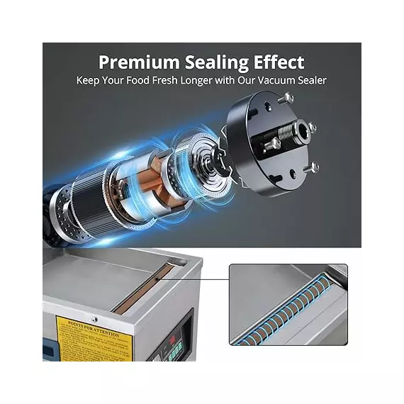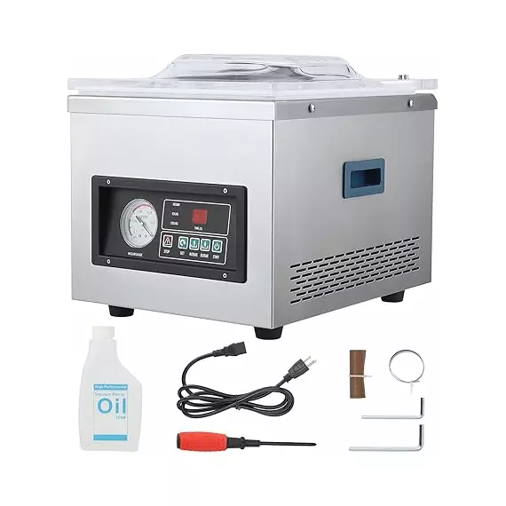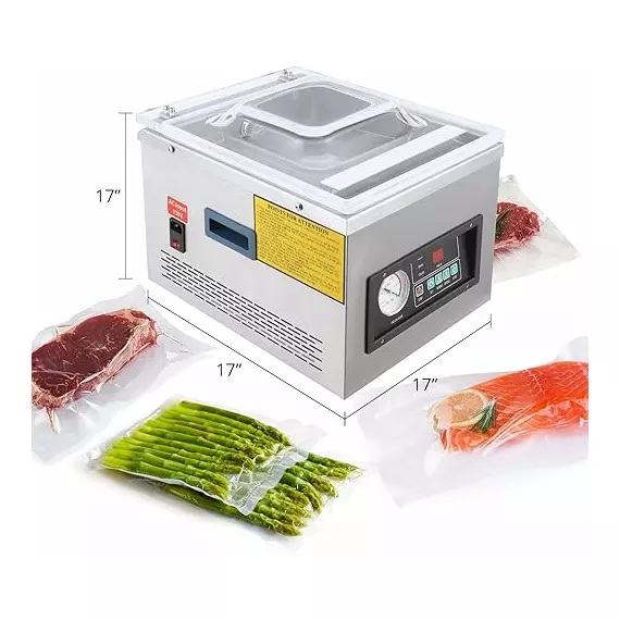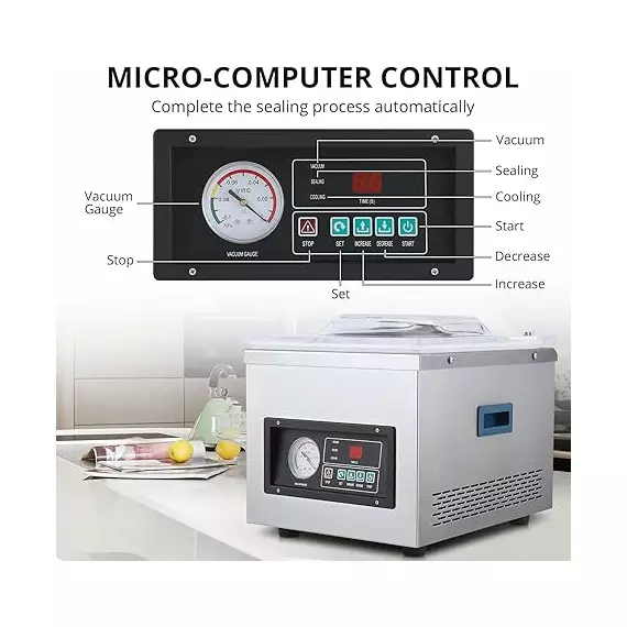 Key Feature: Stainless Steel Structure: This vacuum seal is made of stainless steel, durable, safe and easy to clean. In addition, it is also equipped with a transparent organic glass lid with explosion -proof function, which makes the vacuum and seal process visible to users. Microcomputer Control: Equipped with an intuitive digital panel, vacuum gauge, operating adjustment and sealing temperature zones, and emergency stop button, which can accurately display results in real time. Press the vacuum box cover and the machine automatically starts working and completes the entire process. Extensive Application: Our chamber vacuum sealer machine is widely used in family, supermarkets, hospitals, which is convenient for various fruits, meat, and medicines for vacuum treatment. Specification: Type : Single Chamber Vacuum Machine Material: Stainless Steel Heat Sealing Power: AC 220/50V Dimensions: 860*780*1150mm Machine Weight: 37Kg Package Dimensions: 42*50*46Cm