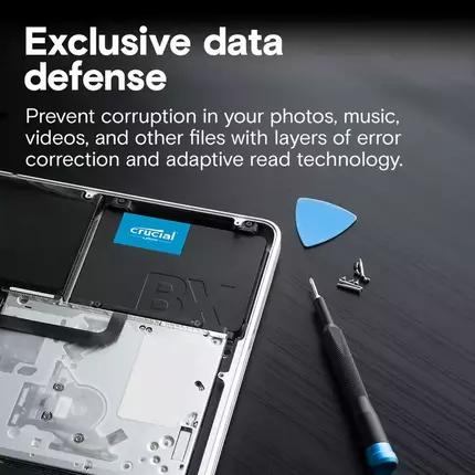 Boot up faster. Load files quicker. Improve overall system responsiveness 300% faster than a typical hard drive Improves battery life because it’s 45x more energy efficient than a typical hard drive Micron 3D NAND – advancing the world's memory and storage technology for 40 years Crucial 3-year limited warranty 2017-2024 Micron Technology, Inc. All rights reserved. Information, products, and/or specifications are subject to change without notice. Neither Crucial nor Micron Technology, Inc. is responsible for omissions or errors in typography or photography. Micron, the Micron logo, Crucial, the Crucial logo, and The Memory & Storage Experts are trademarks or registered trademarks of Micron Technology, Inc. All other trademarks are the property of their respective owners. 1. Typical I/O performance numbers as measured using IOMeter with a queue depth of 32 and write cache enabled. Fresh out-of-the-box (FOB) state is assumed. For performance measurement purposes, the SSD may be restored to FOB state using the secure erase command. System variations will affect measured results. 2. Some of the storage capacity is used for formatting and other purposes and is not available for data storage. 1GB equals 1 billion bytes. 3. Active average power use comparison based on published specs of the 500GB Crucial BX500 SSD internal hard drive. All other capacities of the Crucial BX500 SSD have comparable active average power consumption specs.