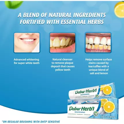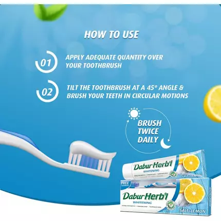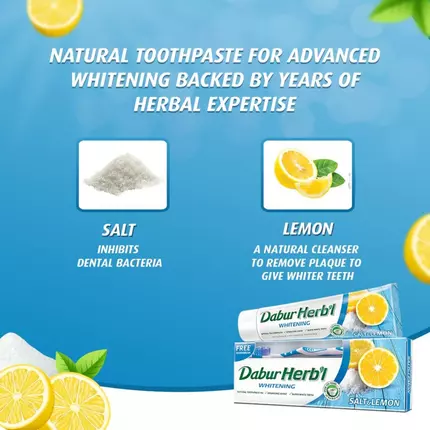 Dabur's Herb'l Salt and Lemon Toothpaste is the ideal blend of two active ingredients making this the perfect teeth whitening toothpaste. This naturally formulated toothpaste can be used by people of all ages for sparkling white teeth and a healthier smile.