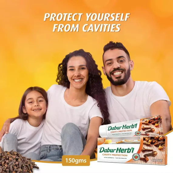 The Dabur Herbal Cavity Protection Clove Toothpaste With Over 130 Years Of Herbal Expertise Protects Your Teeth From Cavity. The Clove Protects Your Precious Smile With Its Fluoride Free Natural Toothpaste Formula With 0 Harmful Chemicals. Smile Confidently With Your Dabur Herbal Clove Toothpaste & Get A Toothbrush Absolutely Free! It'S Time To Bid Goodbye To Cavities.