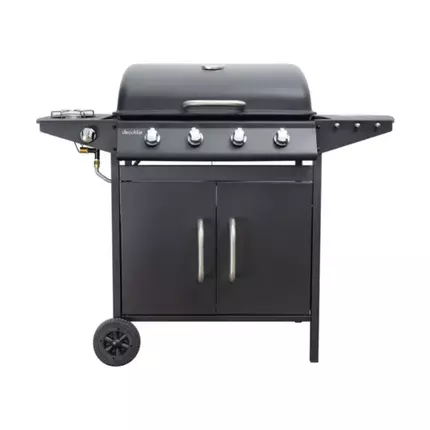 It's so cool to have this Gas BBQ Grill in your yard! Barbecue and chat at the same time, it is so suitable for friends to party together! Specifications: Total rated heat output of 4 main burners: 11.6kW Side Burner Rated Heat Output: 2.3kW Cooking area: 63×37cm Height: 82cm Single firing main burner Piezo ignition side burner With thermometer Injector size: main 0.84mm, side 0.75mm