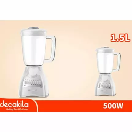 Decakila Blender 500W Capacity 1.5L Jug 2 Speed With Pulse SS Blade Mixer 4-Bladed Stainless Steel Blade KEJB044W Specifications: Capacity: 1.5L Wattage: 500W Voltage: 220-240V~50-60Hz 4-bladed stainless steel blade 2-speed control with pulse Copper wire motor Anti-slip feet design 1 Pcs plastic jug Packed by color box