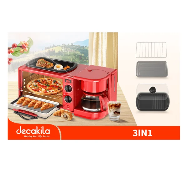 The Decakila Breakfast Maker is a versatile 3-in-1 kitchen appliance that combines an oven, coffee maker, and fryer into one compact unit. With 1050W of power and a 9L oven capacity, it's designed to efficiently handle baking, frying, and brewing your morning coffee, saving both time and counter space.