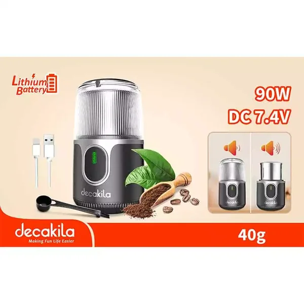 The Decakila Coffee Grinder is a cordless, rechargeable grinder designed for convenience and performance. It features a powerful 90W motor and a durable stainless steel blade to deliver consistent grounds for your perfect cup of coffee.