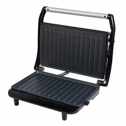 You can cook meat, fish, sandwiches, toast and much more. The ribbed surface and high temperature of the panels contribute to rapid cooking. The panels are made of aluminium with a non-stick coating. Thanks to the design of panels with built-in heaters, heating and transferring temperature to the surface is more efficient, and heating and cooking times are reduced. In single-sided mode, the grill lid swings back 180° and the grill transforms into a large broiler. Both surfaces can be used for cooking. The temperature controller provides the ability to smoothly regulate the temperature and maintain it during the cooking process. And with the help of a timer, you can turn on the heat and set the cooking time. All excess fat and juice from the dishes will fall into the removable tray. Just take out the tray and wash it with detergent! The heating panels are also removable and can be easily cleaned. Specifications: Power:850W Voltage:220-240V~50-60Hz Plate Size: L230×W145mm 2 slice Cool touch safe handle Non-stick coating for easy cleaning