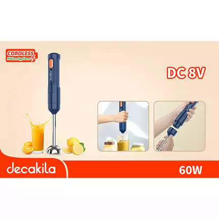 Decakila Hand Blender 60w Cordless 1500 mAh Lithium Battery 7.4v Rechargeable 2 Stainless Steel Blades Anti-Slip Feet Design KMJB037L Wattage: 60W Voltage: DC 7.4V Battery volume: 1 500mAh SUS shaft blend rod. 2 stainless steel blades. Has the ability to blend sauce or juice. Includes: 1 Piece USB charging line Packed by colour box.