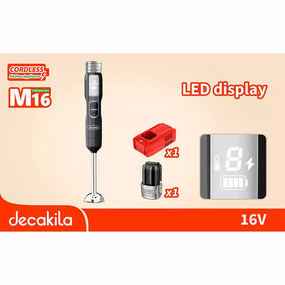Introducing the Decakila Hand Blender, a versatile kitchen companion designed to elevate your culinary experience. With its 2-in-1 set functionality, this blender offers both convenience and versatility. Boasting a powerful 100W DC motor, it effortlessly blends ingredients while operating quietly. Whether you’re mixing juice or preparing meat, its 2-speed and stepless variable speed options provide precise control. Specifications: Wattage: 100W Voltage: DC 16V Battery volume: 2000mAh SUS shaft blend rod 5-speed control With LED display 2 bladed stainless steel blade Have the function of mixing juice or sauce 1 Pcs 2.0Ah battery pack(HMDC005S) 1 Pcs charger Charge volts: 220-240V~50-60Hz (HEDC006B) Packed by color box