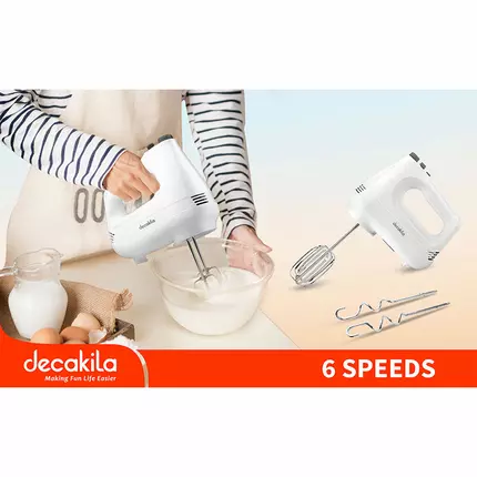 The latest products in your kitchen from Decakila, Very comfortable hand beater. Specifications: Wattage:200W Voltage:220-240V 50Hz 6-speed with turbo With speed control,beater or dough With steel beaters and hook Packed by color box