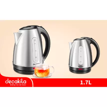 Nothing is more important than safety! Decakila stainless kettle has boil dry protection, making it safer to use Specifications: Stainless kettle Capacity:1.7L Wattage:2200W Voltage:220-240V 50-60Hz With water gauge Open lid by hand Boil dry protection With working light Body with filter design Cord-storage and anti-slip feet design Automatic power off after boiling Packed by color box