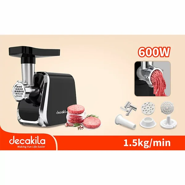 The Decakila Meat Grinder (Model KEMG021B) is a powerful 600W kitchen appliance designed for high-efficiency food processing. It delivers a fast output of 1.5KG per minute, featuring a durable metal construction and multiple stainless steel accessories for versatile grinding, mincing, and sausage-making tasks.