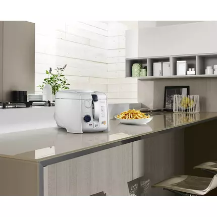 Maximum food capacity 1 kilogram, oil capacity 1-1.2 litres Patented 'Easy Clean System' for oil draining Adjustable thermostat from 150 - 190 degrees Celcius Cool-touch walls Lid and replaceable anti-odour filter can be removed and washed Innovative technologies De’Longhi draws on decades of experience in the field of deep fryers. We know that everyone has their own personal preferences, especially when it comes to cooking. That's why we have a well-stocked range of deep fryers and can therefore meet the individual requirements of every kitchen. De'Longhi Roto-Fry The Roto-Fry system makes classic deep-frying possible with 50% less oil: thanks to the slanted, rotating frying basket, only half the oil is needed and the result is even crispier. The food to be fried is briefly quenched in the air as it rotates, making it particularly crispy and delicious. Characteristics Roto Fry System Thanks to the unique Roto-Fry system with the slanted, rotating frying basket, you can fry with 50% less oil than with traditional deep fryers. Easy clean system The integrated oil drain hose can be used to drain the oil easily and cleanly after use. Cool touch Heat-insulated cool-touch outer walls ensure that you can touch the device with your bare hands without any problems.