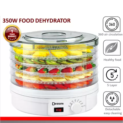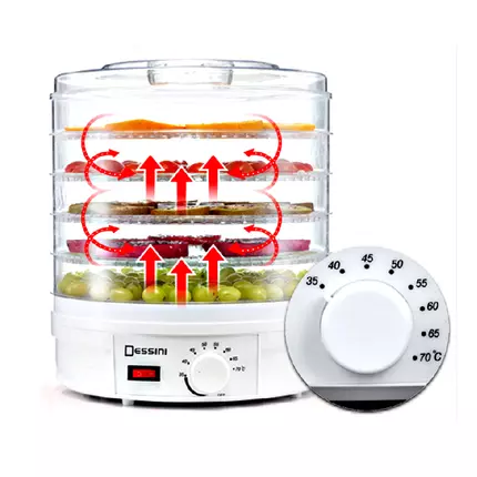 Features: DESSINI 350W Food Dehydrator Hot air circulation drying system Strong heating with ventilation fan provides even drying. Temperature Setting: 35 - 70˚ C Adjustable thermostat lets different foods dry at the proper temperature Food preparation and thickness of food slice will vary drying times. 5 Levels 32cm food drying tray provides sufficient space for home use. Transparent trays allow the user to monitor the desired texture. Always use all 5 tray sections & fill up the lowest level first. Food grade plastic, absolutely guaranteed non-toxic Hydrated fruit snacks are preserved for longer periods of storage for later consumption. Dried fruits and vegetables maintain their nutritional content & natural flavor.