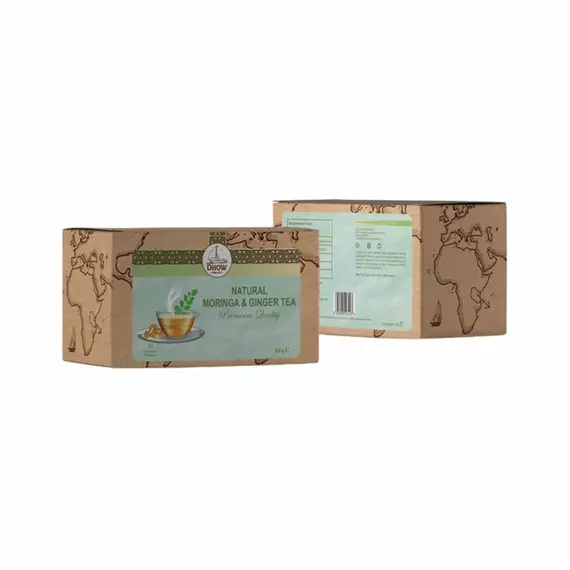 Discover a harmonious blend of nature's goodness with Dhow Herbal Infusion Teas' Organic Ginger/Moringa Herbal Infusion Tea. This exquisite tea is carefully crafted to provide you with a rejuvenating and flavorful experience. Each box contains 25 tea bags, each brimming with the benefits of organic ginger and moringa leaves.