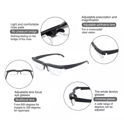 Adjustable magnifier: Rotate the dial to adjust the prescription and magnification to your exact needs. See clearly with the suitable products. Variable range: The diopter range of each lens is from 6.0 to +3.0, which can control the magnification well. In this way, you don't have to buy multiple prescription lenses. Please wear these glasses in your daily work for every activity. Driving, reading, watching TV and using computers - now you need a pair of glasses to do everything. High-performance design: This product has a local edge design for men and women, which is very durable. Describe: It also uses impact-resistant polycarbonate lenses. It's worth it! With the help of a sphere that can precisely adjust the prescription and magnification of each lens, these focusing glasses can meet the needs of most users. Feature: 1. Glasses can variable focus zoom. 2. Instantly control focus, be able to adjust the prescription and magnification in each eye independently. 3. Just turn the dial to adjust the lens. 4. Light in weight. 5. It is easy to use. 6. Convenient to carry. 7. Durable in use. 8. Use for reading and distance vision. 9. For computer, reading, watching TV, day or night driving, keep at desk, by work bench, use as back up spectacles. Specifications: Adjustable focal length: -6.00 to +3.00 Frame color: Black Size: 100mm x 200mm x 70mm/3.94x7. 87x2.76" Material: AP+PC