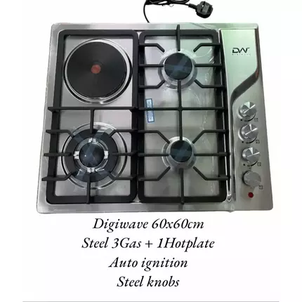 Description DigiWave Gas Hobs Range is great for every kitchen that values cooking with style. You can cook more than one meal at a time with multiple burners in one hob while maintaining the style of your kitchen. Materials used to build this range are timeless and always suitable for your décor. It is easy to integrate into your cooking space, and this range is for those who prefer cooking with ease. This gas hob comes with four burners, heavy-duty cast iron pan supports so that your pans don’t slip while cooking, and Flame-Failure Device to prevent accidental gas leakage. It also has an auto-ignition button to turn the burners ON. The body and panel are made of Stainless Steel, which gives durability and is known for withstanding high temperatures without fail. Feature 3 GAS 1 hotplate burner steel hob Heavy cast iron pan support Auto pulse ignition Triple Ring Wok Burner Rapid Burner Semi Rapid Burner Auxiliary Burner Specification Brand Name: Digi Wave Model: DWGC 2003 Product Dimensions: 60x60 Burner type: 3 GAS 1 hotplate burner Elements: 4 Color: Black Control Console: Knob Fuel type: Electricity Material Type: Steel body