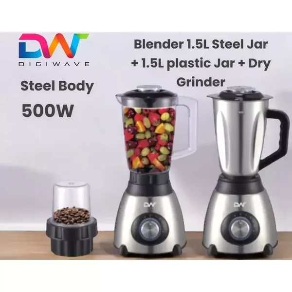 The Digiwave DWBL-1212 Blender is a versatile 500W kitchen appliance designed for a wide range of blending tasks. It comes complete with a 1.5L stainless steel jar, a 1.5L plastic jar, and a small dry mill, making it perfect for liquids, wet mixes, and grinding dry ingredients.