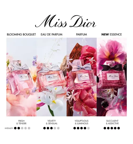 Miss Dior Essence will surprise and draw you in at the same time: the succulent blackberry and elderflower accord transcends a wildly luxurious jasmine bouquet.
