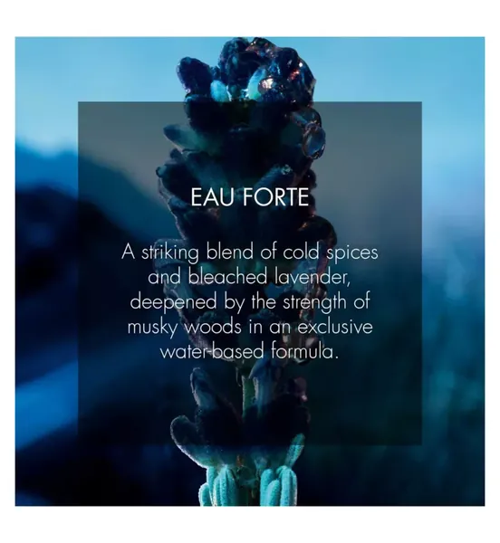 Strengthened by the freshness of water that "drenches" the ingredients, the scent of the fragrance is composed around notes of cool spices, blanched lavender and musky woods.