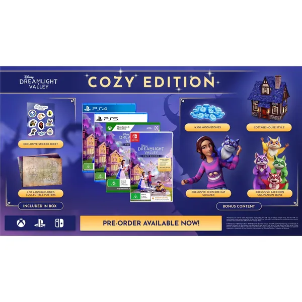 Disney Dreamlight Valley: Cozy Edition is an exclusive retail offering of Disney Dreamlight Valley featuring a sticker set, collectible poster, full access to the base game and exclusive digital bonuses.