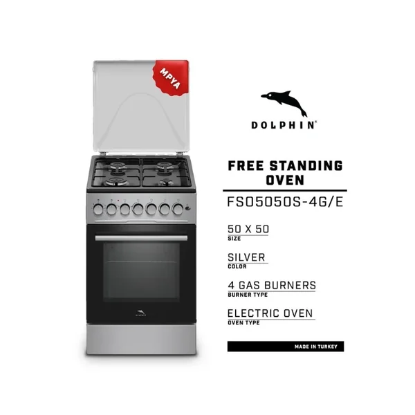 Upgrade your kitchen with the professional-grade Dolphin FS05050S-4G/E Free Standing Cooking Range. This sleek silver appliance, crafted in Turkey, combines four powerful gas burners with a spacious electric oven for versatile and efficient cooking.