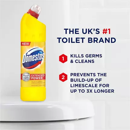 Domestos Citrus Thick bleach and disinfects surfaces around your home and removes stains. Domestos is a bathroom cleaner designed to kill germs and bacteria Bathroom cleaner that kills 99.9% of bacteria and germs and removes stains. Use Domestos, the UK’s No.1 Bleach Brand, to make your whole bathroom cleaner. Domestos Toilet Bleach is a multi-purpose cleaner that will disinfect your toilet and surfaces around your home Use our toilet cleaner with a Domestos Toilet Rim Block for maximum germ protection.
