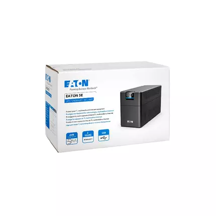 Features: Automatic Voltage Regulation (AVR) Saves space with a compact tower design HID-compliant USB port, for automatic integration with major operating systems (Windows/Mac OS/Linux) Specifications: Brand: Eaton Model: 5E1200i Type: UPS Product Length/Depth: 330 mm Product Height: 180 mm Product Width: 133 mm Product Weight: 8.13 kg Topology: Line-interactive Form factor: Tower Construction type: Free standing model Color: Black VA rating: 1200 VA Wattage: 660 W Rack mounting kit: No Surge protection: Yes Internal bypass: No Hot swap power : No Auto shutdown function : Yes Primary frequency - max : 63 Hz Primary frequency - min : 45 Hz Input connection : C14 Input nominal voltage : 230V default (220/230/240V) Nominal frequency : 50/60 Hz Input frequency range : 45-63 Hz Receptacle : (6) C13 Number of Outputs C13 : 6 Voltage : 230V Output nominal voltage : 230V Feed type : 1 Voltage type : AC Battery management : Automatic battery test, deep-discharge protection, cold-start capable Battery rating : 12 V / 7 Ah Battery type : Sealed, lead-acid Extended battery capability : No Communication : USB port (HID compliant) Expansion slots : No Ethernet interface : No Includes network card : No Software compatibility : Eaton UPS Companion (enables safe system shutdown, energy usage metering and configuration of UPS settings) User interface : LEDs Type of interface : USB Potential free switch contact : No Relative humidity : 0-90% non-condensing Temperature range : 0° to 40°C (32° to 104°F) Operating temperature - max : 40 °C Operating temperature - min : 0 °C Output apparent power : 1200 VA Input voltage - max : 300 V Input voltage - min : 140 V Output voltage - max : 257 V Output voltage - min : 195 V Secondary frequency - max : 60 Hz Secondary frequency - min : 50 Hz Battery quantity : 2 Efficiency : 95 Input voltage range : 140-300 V Output frequency : 50/60 Hz Output voltage range : 195-257 V Phase (input) : 1 Phase (output) : 1 Package contents: (2) IEC-IEC output cables Quick start Safety instructions Compliances: CB LVD Directive EMC Directive RoHS Directive Packaging Directive WEEE Directive Batteries Directive Certifications: IEC/EN 62040-1 IEC/EN 62040-2 CE EAC UKCA Cm Ukr IEC/EN 62040-3