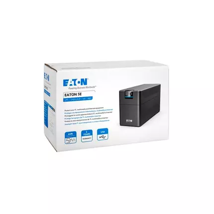 Features: Automatic Voltage Regulation (AVR) Saves space with a compact tower design HID-compliant USB port, for automatic integration with major operating systems (Windows/Mac OS/Linux) Specifications: Brand: Eaton Model: 5E2200i Type: UPS Product Length/Depth: 330 mm Product Height: 180 mm Product Width: 133 mm Product Weight: 9.82 kg Warranty: 2 year Topology: Line-interactive Form factor : Tower Construction type : Free standing model Color : Black VA rating : 2200 VA Wattage : 1200 W Rack mounting kit : No Surge protection: Yes Internal bypass : No Hot swap power : No Auto shutdown function : Yes Primary frequency - max : 63 Hz Primary frequency - min : 45 Hz Input connection : C14 Input nominal voltage : 230V default (220/230/240V) Nominal frequency : 50/60 Hz Input frequency range : 45-63 Hz Receptacle : (6) C13 Number of Outputs C13 : 6 Voltage : 230V Output nominal voltage : 230V Feed type : 1 Voltage type : AC Battery management : Automatic battery test, deep-discharge protection, cold-start capable Battery rating : 12 V / 9 Ah Battery type : Sealed, lead-acid Extended battery capability : No Communication : USB port (HID compliant) Expansion slots : No Ethernet interface : No Includes network card : No Software compatibility : Eaton UPS Companion (enables safe system shutdown, energy usage metering and configuration of UPS settings) User interface : LEDs Type of interface : USB Potential free switch contact : No Relative humidity : 0-90% non-condensing Temperature range : 0° to 40°C (32° to 104°F) Operating temperature - max : 40 °C Operating temperature - min : 0 °C Output apparent power : 2200 VA Input voltage - max : 300 V Input voltage - min : 140 V Output voltage - max : 257 V Output voltage - min : 195 V Secondary frequency - max : 60 Hz Secondary frequency - min : 50 Hz Battery quantity : 2 Efficiency : 95 Input voltage range : 140-300 V Output frequency : 50/60 Hz Output voltage range : 195-257 V Phase (input) : 1 Phase (output) : 1 Package contents: (2) IEC-IEC output cables Quick start Safety instructions Compliances: CB LVD Directive EMC Directive RoHS Directive Packaging Directive WEEE Directive Batteries Directive Certifications: IEC/EN 62040-1 IEC/EN 62040-2 CE EAC UKCA Cm Ukr IEC/EN 62040-3