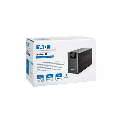 Specifications: Brand: Eaton Model: 5E 900i USB-BS Type: UPS Active power: 480 W Apparent power: 900 VA Backup time (100% load): 8 min Battery - Automatic battery test: Yes Battery - Cold start: Yes Battery capacity: 9 Ah BatteryType: Lead-acid Product Length/Depth: 288 mm Product Height: 148 mm Product Width: 100 mm Product Weight: 5.1 kg Warranty: 2 year Compliances: CB LVD Directive EMC Directive RoHS Directive Packaging Directive WEEE Directive Batteries Directive Certifications: IEC/EN 62040-1 IEC/EN 62040-2 CE EAC UKCA Cm Ukr IEC/EN 62040-3