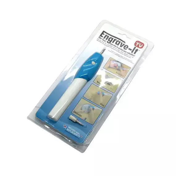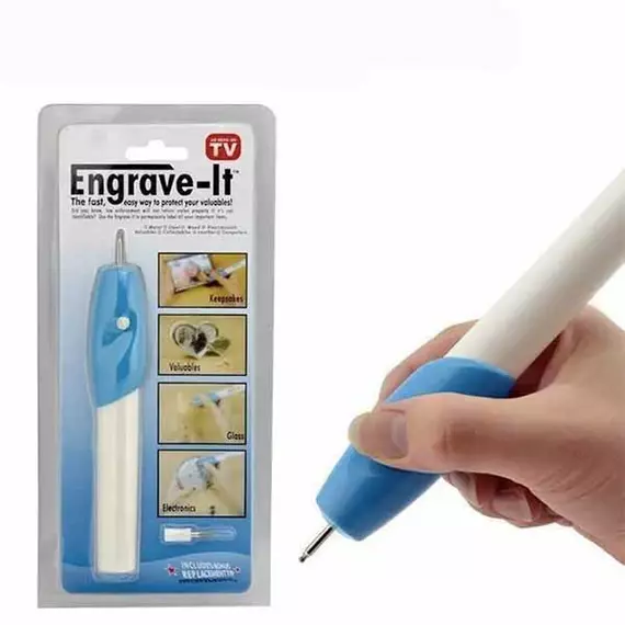 Engrave it Permanently label all of your important items! Engrave It engraving tool allows you to engrave nearly anything you can imagine on almost any type of surface: wood, metal, plastic, leather, glass and much more. It is safe and easy to use. Works just like a pen. Engrave your child’s lunch box or guard against theft by engraving your MP3 player / phone / tablet / laptop. Engrave ornaments, silver pieces, lockets, rings and more. Great arts and crafts fun for the whole family. Personalize your keepsakes, Engrave It is an inexpensive alternative to costly engraving services! Engrave-It Pro Engraving Pen engraves almost any surface in seconds! Works just like a pen! Brand: Engrave It Requires 2 x AA batteries (NOT included) Use on: Wood, Metal, Plastic, Glass, Electronics Hold the engrave like a pencil with your thumb over the control button Press the control button in with your thumb. Applying slight pressure, press tool down on surface to be engraved To turn off simply release thumb pressure from control button Color: White Warranty: 30 Days Note: Always wears protective eyewear when engraving and wash hands immediately after use.