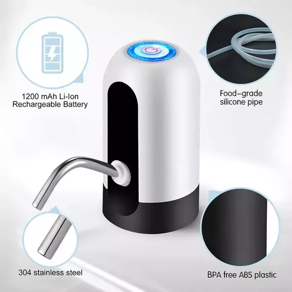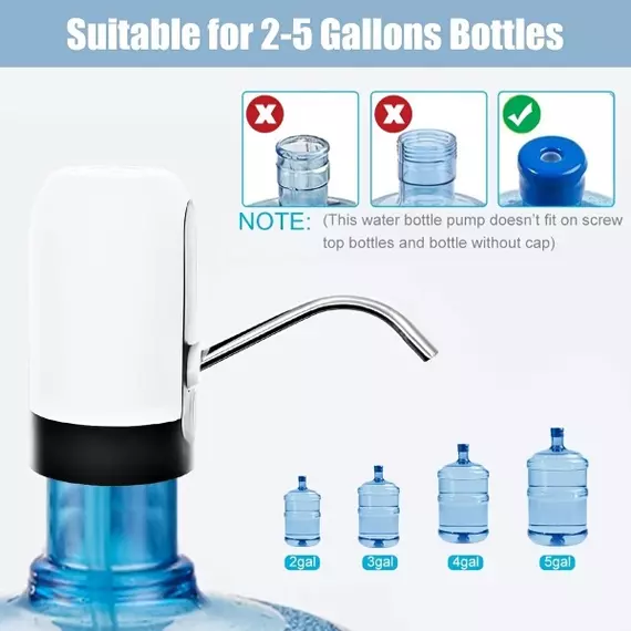 Our smart electric water bottle pump will make life easier and better! Having this machine to pump the water out makes it hassle-free. Women and even children don't have to lift heavy bottles and can save on the cost of large water dispensers by pressing a button. Food grade water pump, BPA free, no toxic, no smell, for 2,3,4,5 Gallon water bottle and other standard size bottles. Makes Life Easier and Better! Why Choose Our Water Pump Dispenser? 1. Safe Material: BPA free, Food grade silicone hose, 304 stainless steel, high density ABS plastic shell. 2.USB Rechargeable Battery: Built in rechargeable battery. Can used for 30-40 days or around 4-6 bottles of 5 gallon water once full charged. No need to charge every day. 3. Fits All Standard Size Bottle: Standard size is 2.16 Inch (5.5cm) neck size, fits for 2, 3, 4, 5 gallon and other standard size water bottle. 4. Extensive use: Portable device for both indoor and outdoor use like office, home, Kitchen, camping, picnic, activities, etc