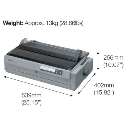 The 24-pin 136 column printer is designed to offer busy offices unparalleled performance and reliability. High Speed The 24-pin wide carriage LQ-2190 boosts a high print speed of up to 480 cps (10 cpi) makes it an ideal solution for high volume applications. Robust and Reliable With MTBF (mean time between failure) of 20,000 power-on hours and a print head life of 400 million strokes per wire, this extremely robust printer is suitable for medium and large print volumes. Both features guarantee uninterrupted operation and less maintenance, in turn enhancing your productivity and reducing your total cost of ownership. Versatile Connectivity With a built-in USB, parallel interface and optional network print server, the LQ-2190 is engineered for versatile connectivity. What’s more, choice of front, rear and bottom paper paths gives you even more control over desk space management. High Ribbon Yield With a ribbon life of around 15 million characters, the ribbon replacement intervals are longer which in turn lower running costs and total cost of ownership. Features 24-pin wide carriage Speed: up to 480 cps (10cpi) MTBF: 20,000 Power on Hours USB and Parallel ports Optional network print server Epson LQ-2190 Dot Matrix Printers Impact dot matrix 136 columns 24 Needles RS-232 (optional) Ethernet interface (100 Base-TX / 10 Base-T) (optional) Printing Technology: Print Method: Impact dot matrix Control Panel: 6 switches and 10 LEDs are located on the panel Print Direction: Bi-direction with logic seeking Number of Pins in Head: 24 pins Control Code: ESC/P2 and IBM PPDS emulation Print Speed: High Speed Draft: 10 cpi: 480 cps 12 cpi: 576 cps Draft: 10 cpi: 360 cps 12 cpi: 432 cps 15 cpi: 540 cps (Condensed) 17 cpi: 308 cps (Condensed) 20 cpi: 360 cps Letter Quality: 10 cpi: 120 cps 12 cpi: 144 cps 15 cpi: 180 cps (Condensed) 17 cpi: 205 cps (Condensed) 20 cpi: 240 cps Reliability: MVBF: 40 million lines (except print head) MTBF: 20,000 Power On Hours (POH) (25% Duty) Printhead Life: 400 million strokes/wire Print Characteristics: Character Sets: 14 international character sets and one legal character sets. 1 Italic and 12 graphical character tables: Italic table, PC437 (US Standard Europe), PC850 (Multilingual), PC860 (Portuguese), PC861 (Icelandic), PC863 (Canadian-French), PC865 (Nordic), BRASCII, Abicomp, Roman 8, ISO Latin 1, PC 858, ISO 8859-15 Bitmap Fonts: Epson Draft / Epson Courier: 10cpi, 12cpi, 15cpi; Epson Roman / Epson Sans Serif: 10cpi, 12cpi, 15cpi, Proportional; Epson Prestige: 10cpi, 12cpi; Epson Script / OCR-B / Orator / Orator-S / Epson Script C: 10cpi, Proportional Scalable Fonts: Epson Roman / Sans Serif / Roman T / Sans Serif H: 10.5pt., 8pt. - 32pt. (every 2pt.) Barcode: EAN-13, EAN-8, Interleaved 2 of 5, UPC-A, UPC-E, Code 39, Code 128, POSTNET Paper Path: Manual Insertion: Front or Rear In, Top out Push Tractor: Front of Rear In, Top out Pull Tractor: Front or Rear or Bottom in, Top out Paper Media: Cut Sheet (Single Sheet): Front Entry: Length: 148 - 420mm (5.8" - 16.5"), Width: 100 - 420mm (3.9" - 16.5"), Thickness: 0.065 - 0.14mm (0.0025" - 0.0055") Rear Entry: Length: 100 - 420mm (3.9" - 16.5"), Width: 100 - 420mm (3.9" - 16.5"), Thickness: 0.065 - 0.14mm (0.0025" - 0.0055") Cut Sheet (Multi-part Forms): Front Entry: Length: 148 - 420mm (5.8" - 16.5"), Width: 100 - 420mm (3.9" - 16.5"), Thickness: 0.12 - 0.46mm (0.0047" - 0.018") (Total) Rear Entry: Length: 100-420mm (3.9" - 16.5"), Width: 100 - 420mm (3.9" - 16.5"), Thickness: 0.12 - 0.46mm (0.0047" - 0.018") (Total) Copies: 1 Original + 5 Copies Envelopes: Thickness: 0.16 - 0.52mm (0.0063" - 0.0205") (Total) Envelope (No.6): Rear Entry: Length: 92mm (3.6"), Width: 165mm (6.5"), Thickness: 0.16 - 0.52mm (0.0063 - 0.020") (Total) Envelope (No.10): Rear Entry: Length: 105mm (4.1"), Width: 241mm (9.5"), Thickness: 0.16 - 0.52mm (0.0063 - 0.020") (Total) Continuous Paper (Single Sheet): Front, Rear, Bottom Entry: Length: 101.6 - 558.8mm (4.0" - 22.0"), Width: 101.6 - 406.4mm (4.0" - 16.0"), Thickness: 0.065 - 0.46mm (0.0025" - 0.018") (Total) Copies: 1 Original + 5 Copies Continuous Paper (Multi-part Forms): Front, Rear, Bottom Entry: Length: 101.6 - 558.8mm (4.0" - 22.0"), Width: 101.6 - 406.4mm (4.0" - 16.0"), Thickness: 0.065 - 0.46mm (0.0025" - 0.018") (Total) Copies: 1 Original + 5 Copies Label (Base Sheet): Bottom Entry: Length: 101.6 - 558.8mm (4.0" - 22.0"), Width: 101.6 - 406.4mm (4.0" - 16.0"), Thickness: 0.16 - 0.19mm (0.0063" - 0.0075") (Total) Card: Front, Rear Entry: Length: 148 - 200mm (5.8 - 7.8"), Width: 100 - 200mm (3.9 - 7.8"), Thickness: 0.22mm (0.0087") Roll Paper: Rear Entry: Diameter: 127mm (5.0"), Width: 216mm (8.5"), Thickness: 0.07 - 0.09mm (0.0028 - 0.0035") Line Spacing: 4.23mm (1/6”) or programmable in increments of 0.0706mm (1/360”) General: Memory Buffer: 128 KB Supported OS and Applications: Supported OS: Microsoft® Windows® 2000 / XP / Vista / 7 / 8 / 8.1 / 10 Utility: Epson Status Monitor 3 (Microsoft® Windows® 2000 / XP / Vista / 7 / 8) Epson Printer Setting (Microsoft® Windows® 2000 / XP / Vista / 7 / 8) Dimensions and Weight: Dimensions (W x D x H): 639 x 402 x 256 mm Weight: 13kg Consumables: Ribbon Cartridge Black: Approx. 15 million characters *2 - C13S015531 Options: Options: Epsonnet 10/100 Base TX Int.Printer Server – C12C824352 Pull Tractor Unit – C12C800322 Serial I/F Card No Buffer Type-B - C824432 Environmental Conditions (Operating): Temperature: 5 - 35°C (Operating*2), 15 - 25°C (Operating*2 *3) Humidty: 10 - 80% RH (Operating*2), 30 - 60% RH (Operating*2 *3) Acoustic Noise: Acoustic Noise: 54 dB Interface: Interface: Bi-directional Parallel Interface (IEEE-1284 nibble mode supported), USB 2.0 (Full Speed), Type B I/F Level 2 (Option)