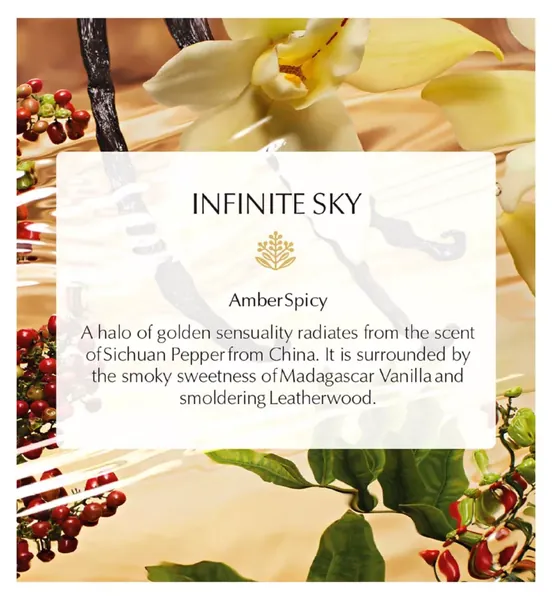 A halo of golden sensuality radiates from the scent of Sichuan Pepper from China. It is surrounded by the smoky sweetness of Vanilla and smoldering Leatherwood. As brilliant as a sky at sunset.