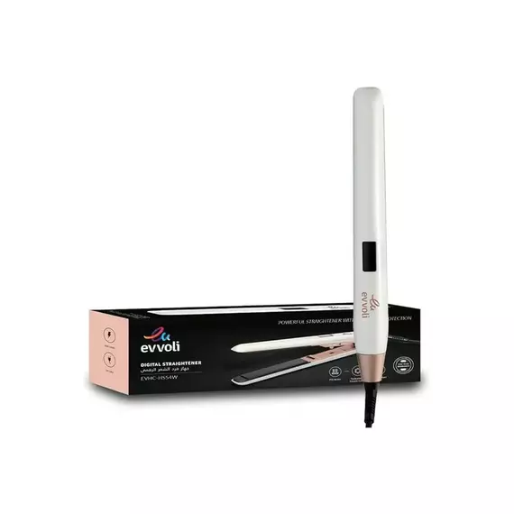 Features: Advanced PTC Heating Technology: The straightener features PTC heating for quick and even heat distribution, allowing you to achieve your desired styling temperature in seconds. Tourmaline on Ceramic Coating: The tourmaline-infused ceramic plates reduce frizz and static, promoting smooth, shiny hair while minimizing heat damage. Digital Display: The integrated digital display allows for precise temperature control, ensuring you can select the ideal setting for your hair type. Ionic Feature: The ionic technology helps to eliminate static and enhance shine, giving your hair a polished finish with every use. User-Friendly Design: With a sleek and ergonomic design, this straightener is easy to handle, making styling comfortable and efficient. Safety Features: Designed with an automatic shut-off feature, you can enjoy peace of mind knowing the straightener will turn off after a period of inactivity, enhancing safety during use General Specifications: PTC heater Ceramic coated extra-long floating heat plates (25 x 110mm) Ionic Feature LCD display in white color Temperature auto lock function 130°C to 230°C by steps of 10°C with +/- press button for selection Power On / Off switch Lockable handle Swivel power cord Auto shut-off after 60 minutes Voltage (V): 220-240 Frequency (Hz): 50/60 Rated power (W): 50-54