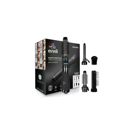 Features: 6-in-1 Versatility: Combines multiple styling tools into one, allowing you to straighten, curl, and create various hairstyles with ease, perfect for diverse hair types. Cool Shot Feature: Includes a cool shot function that helps set your styles, providing long-lasting results while minimizing heat damage to your hair. Three Heat Settings: Offers three adjustable heat settings, allowing you to customize the temperature according to your hair type and styling needs for optimal results. Ionic Technology: Equipped with ion jet technology that reduces frizz and enhances shine, ensuring smooth and polished hairstyles with every use. Powerful 1200W Performance: Delivers fast heating and efficient styling, cutting down your grooming time while ensuring consistent performance. Ergonomic Design: Features a lightweight and ergonomic design for comfortable handling, making it easy to maneuver while styling your hair. Sleek Black Aesthetic: The modern black finish adds a touch of elegance, making it a stylish addition to your beauty tools collection. Easy to Use: Designed for user-friendly operation, making it suitable for both professionals and at-home styling, ensuring great results with minimal effort General Specifications: Model Number: EVHC-AS1200B Colour: Black Brand: Evvoli Power Supply: 220-240 Volts Power Consumption: 1200W Product Type: Hair Styler Cool shot feature 2 slide switches provide 2 speed & 3 heat settings Ionic Feature Hinge type end cap for easy cleaning Hanging loop