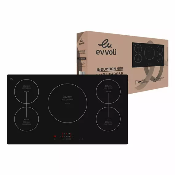 Evvoli Induction Hob 9400W 5 Burners Soft Touch Control With 9 Stage Power IH905B This product is featuring 5 zones, 9 power levels and a boost function for each zone, the evvoli induction hob delivers responsive power for all your cooking needs. the front and centre touch controls ensure simple, reliable operation. Intelligent safety features for peace of mind, this model has a child lock feature and auto safety cut off, making it ideal for use in modern family homes. there's also a residual heat indicator to let you know if the heat zones are still hot. Features: 5 cooking zones - featuring 5 zones, 9 power levels and a boost function for each zone, the evvoli induction hob delivers responsive power for all your cooking needs. the front and centre touch controls ensure simple, reliable operation. This premium evvoli induction hob range features sleek, stylish appliances with black and dark steel accents. this evvoli induction toughened, schott glass induction hob is designed to fit seamlessly into your kitchen Intelligent safety features - for peace of mind, this model has a child lock feature and auto safety cut off, making it ideal for use in modern family homes. there's also a residual heat indicator to let you know if the heat zones are still hot. Reliable For Life: 2 Years Free Warranty Specifications: Power Supply: 220~240V, 50/60Hz, 1Ph Rated Power (W): 9700 Power Setting: 9 Control Mode: Touch Rear Left Size (mm): 180 Rear Left Power (W): 1800/2300 Rear Right Size (mm): 180 Rear Right Power (W): 1800/2300 Center Size (mm): 280 Center Power (W): 3000/4000 Front Left Size (mm): 180 Front Left Power (W): 1800/2300 Front Right Size (mm): 180 Front Right Power (W): 1800/2300 Control Mode: Touch Child Lock: Yes Timer: Yes Excess Heat Indicate: Yes Auto Check Pot: Yes Auto Safety Power Off: Yes Boost: Yes Net Weight (Kg): 13.9 Gross Weight (Kg): 16.1 Product Dimension (LxWxH) (mm): 900x520x60 Packing Dimension (LxWxH) (mm): 1050x675x145 Container Loading 20 feet (set): 255 Container Loading 40’feet (set): 510 Container Loading 40’HC (set): 612
