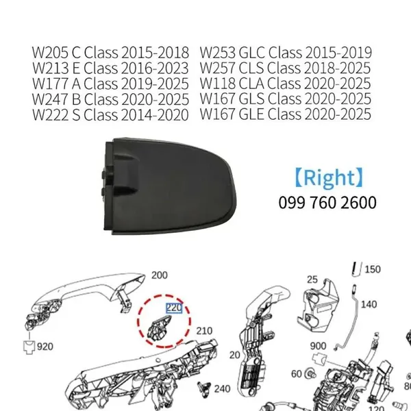 COMPATIBLE WITH MERCEDES BENZ A B C E S GLA GLC CLA GLE GLS CLASS W177 W247 W118 W205 W222 W223 W253 W254 W213 2015+ EXTERIOR DOOR PULL HANDLE FIXED BASE BUCKLE CAP COVER 997602600 RIGHT