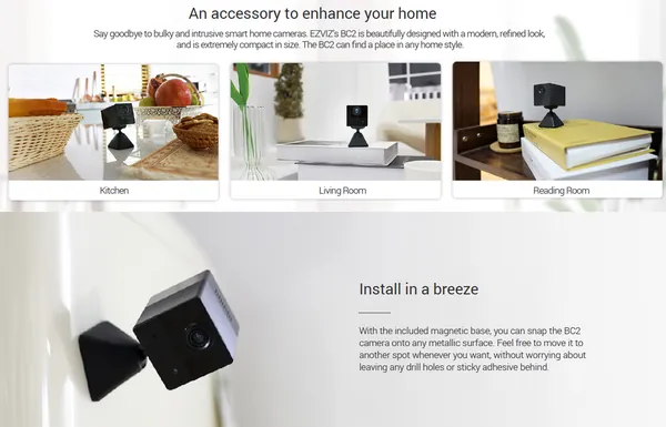 - With a small size of 3.9 3.9 5 cm, this battery camera can be placed almost anywhere in your home. Mount it on the magnetic base (included in the package), attach it to a metallic surface, and it s good to go. No more worrying about leaving any drill holes or sticky adhesive.