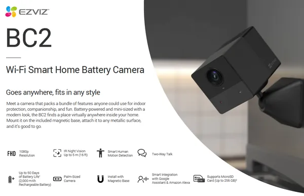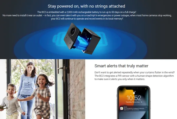 - The BC2 is embedded with a 2,000 mAh rechargeable battery to run up to 50 days on a full charge (daily 5 minutes) No more need to install it near an outlet - in fact, you can even take it with you on a road trip! In emergencies or power outages, when most home cameras stop working, your BC2 will continue to operate and record events.