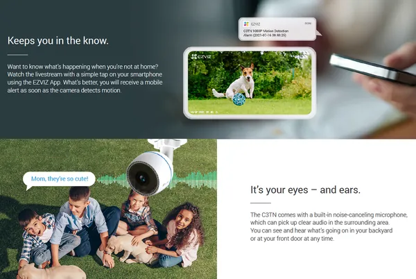 - Want to know what’s happening when you’re not at home? Watch the live stream with a simple tap on your smartphone using the EZVIZ App. What’s better, you will receive a mobile alert as soon as the camera detects motion.
