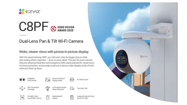 With the award-winning C8PF, you will never miss the bigger picture while also seeing what s important - down to every detail. This pan-tilt-zoom camera features advanced dual-lens technologies to fulfill unprecedented 8 mixed zoom for home protection and provides a picture-in-picture video display mode for both wide and close-up views.