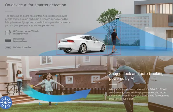 - The C8W Pro 2K elevates the convenience provided by a smart security camera. Thanks to on-device AI, it is able to differentiate people and vehicles from other moving objects, and can automatically lock on and follow human movements to record important moments. Despite complex tracking capability, it provides easy control to auto-resume its pre-set viewing angle through one click. Use it to watch over your home entrance or backyard, for 24/7 all-round protection with 2K clarity.