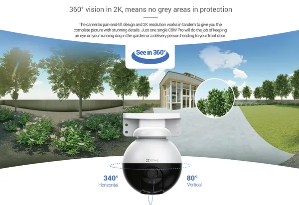 - The camera s pan-and-tilt design and 2K resolution works in tandem to give you the complete picture with stunning details. Just one single C8W Pro will do the job of keeping an eye on your running dog in the garden or a delivery person heading to your front door.